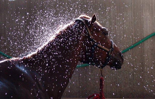 To get your horses’ body temp to cool down, you can speed the process by taking him to a shaded area, hose his entire body with cold water- Cold water doesn’t harm your horse. Jonathan Foreman, DVM, University of Illinois, states “if you put nearly freezing water in large volumes all over the exercising muscles of the horse, you can draw a lot of heat out of the muscles and horse will not tie up afterward.” So give your horse a shower after a rough ride, he will be happy you did!